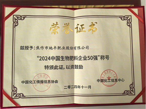 100 強”和“中國生物肥料50強”榮譽稱號。