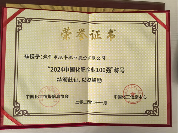 2024年11月29日,一條喜訊從鄭州傳來,在中國化肥企業(yè)100強評選活動暨中國化肥產業(yè)新質生產力論壇上,焦作市地豐肥業(yè)股份有限公司再次榮獲“中國化肥企業(yè)