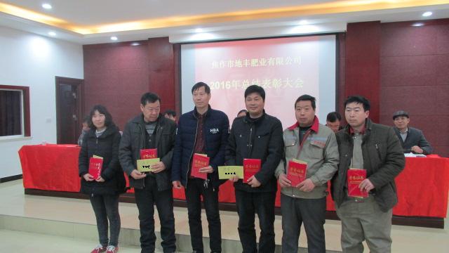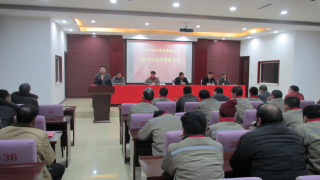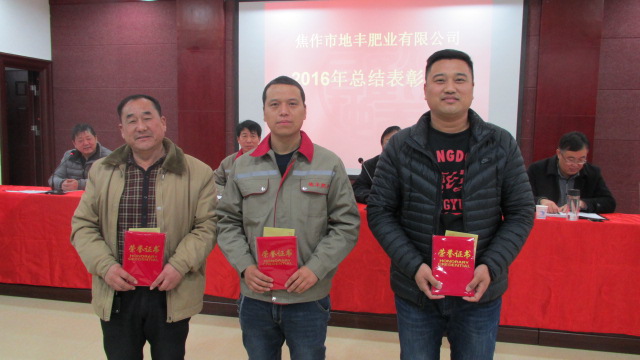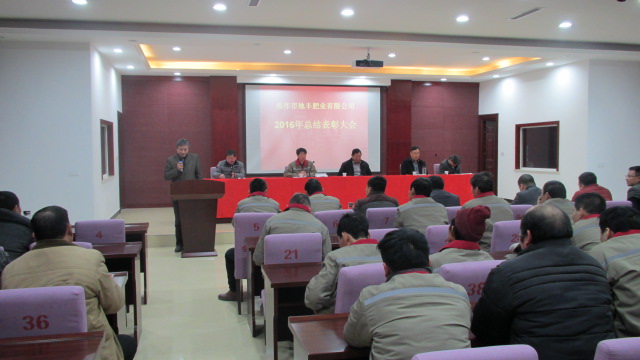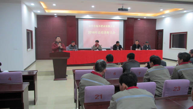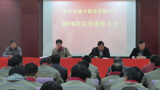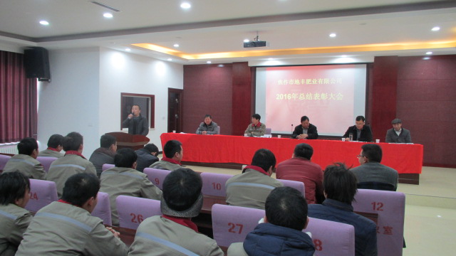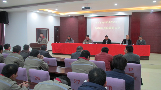 1月22日,焦作市地豐肥業有限公司2016年度總結表彰大會在三樓多功能廳隆重舉行。公司董事長李戰通,生產副總褚萬里、銷售副總林現仁等領導出席會議。